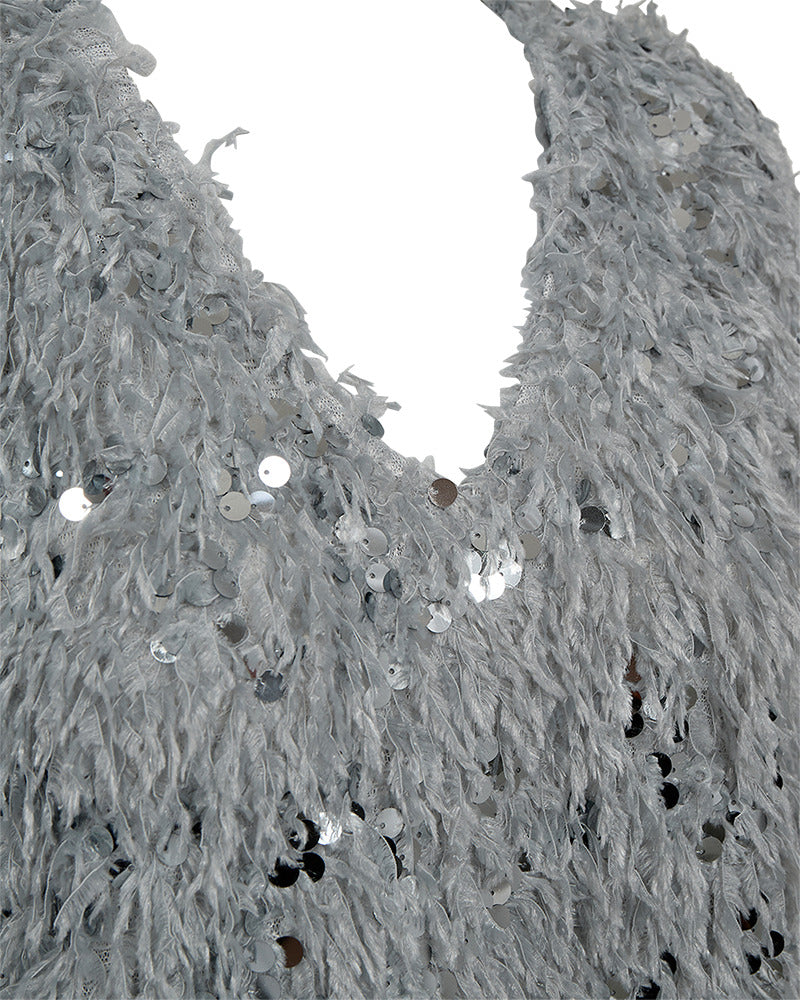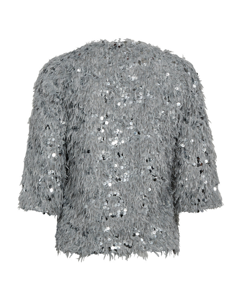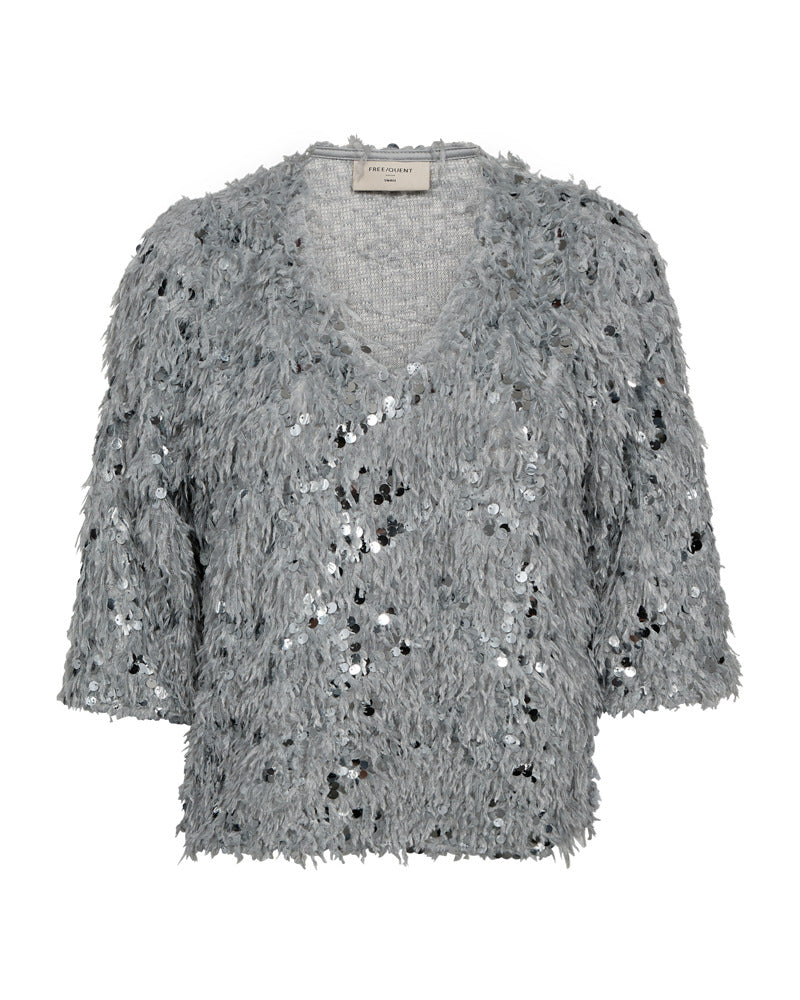 Deze verfijnde FQNOLLA-BLOUSE Zilver vangt de Scandinavische eenvoud in een elegant jasje. Met zijn comfortabele pasvorm en subtiele V-hals biedt dit item een ingetogen chic uitstraling. De zilveren kleur en de ingetogen glans van de pailletten maken het een tijdloze toevoeging aan je garderobe.