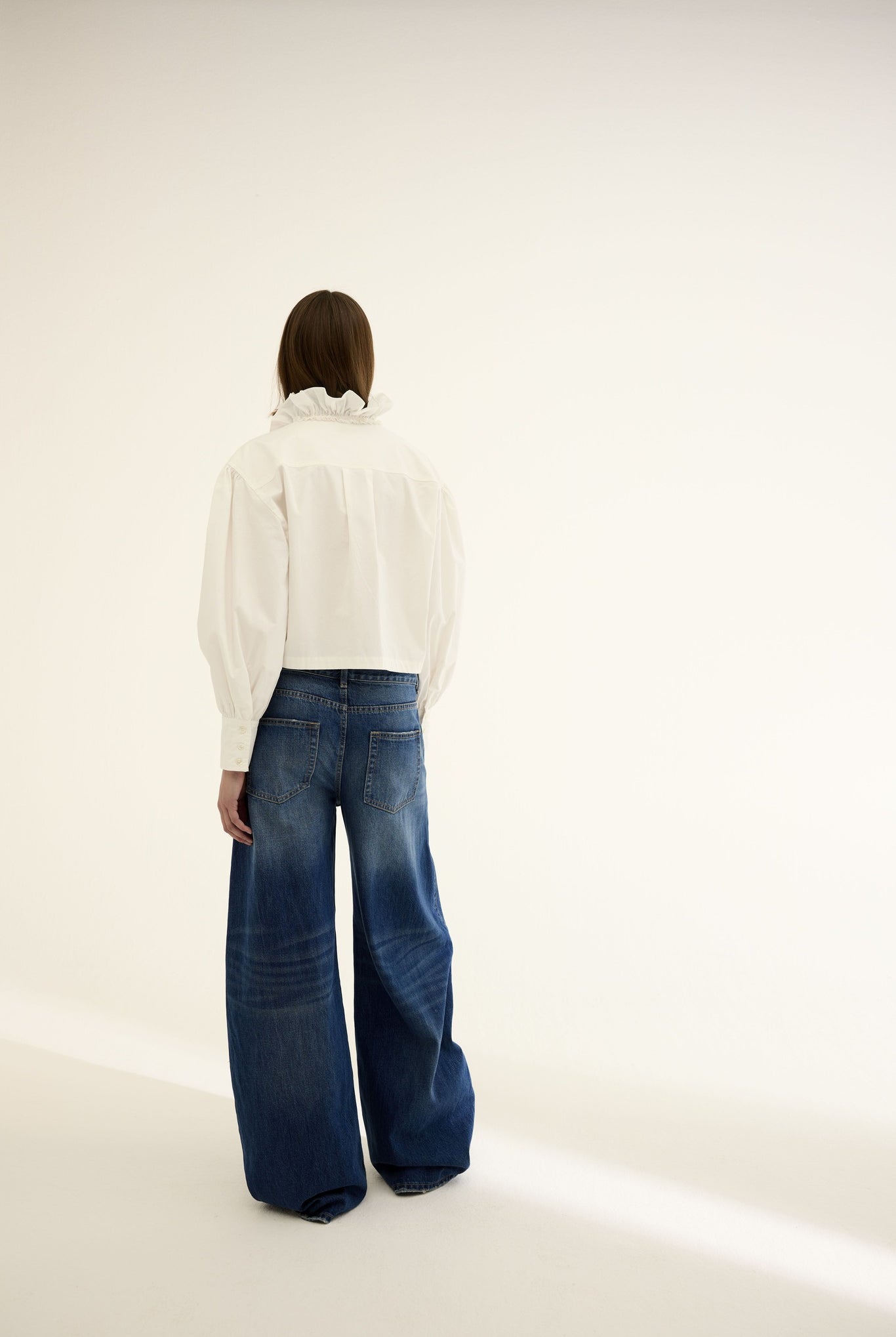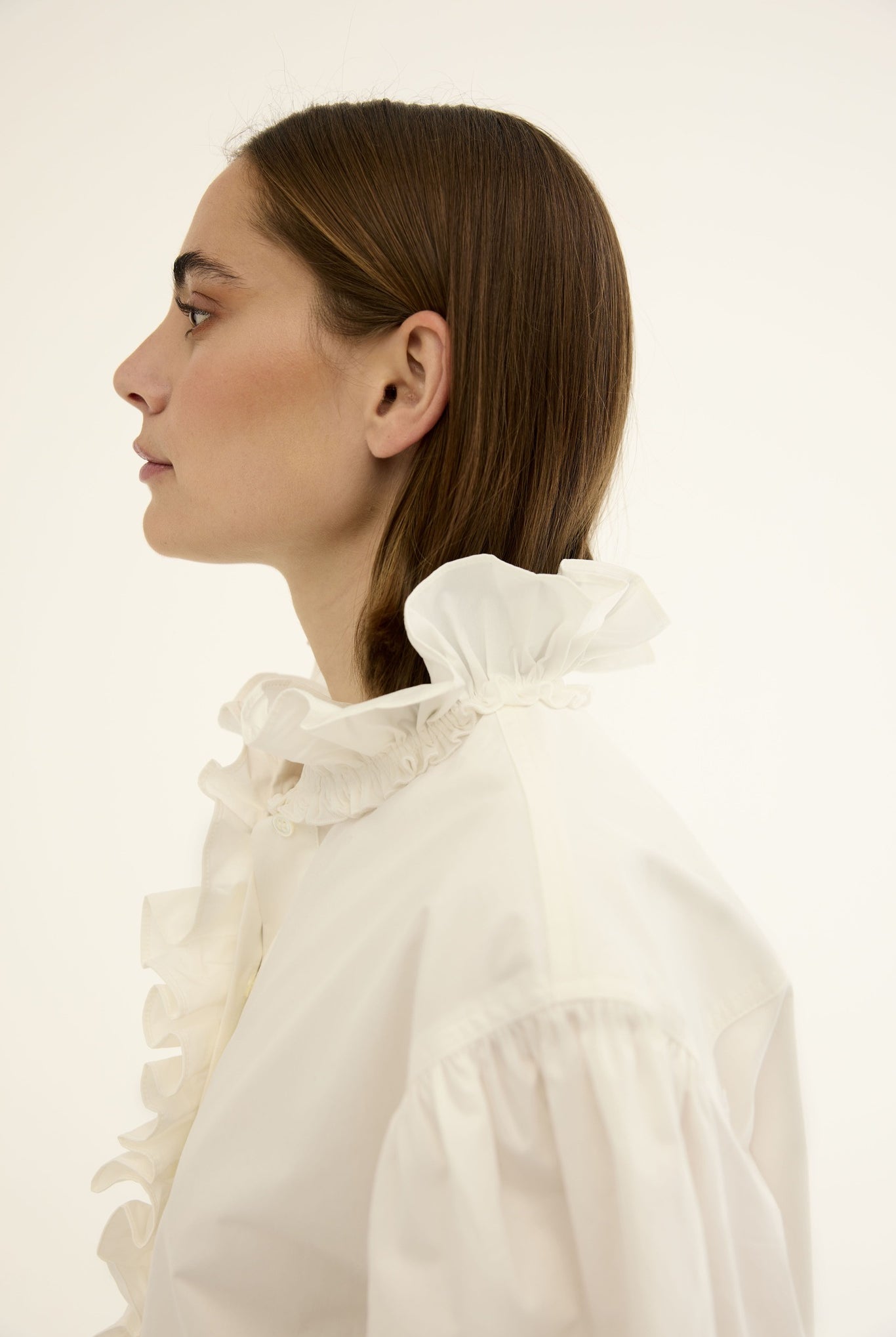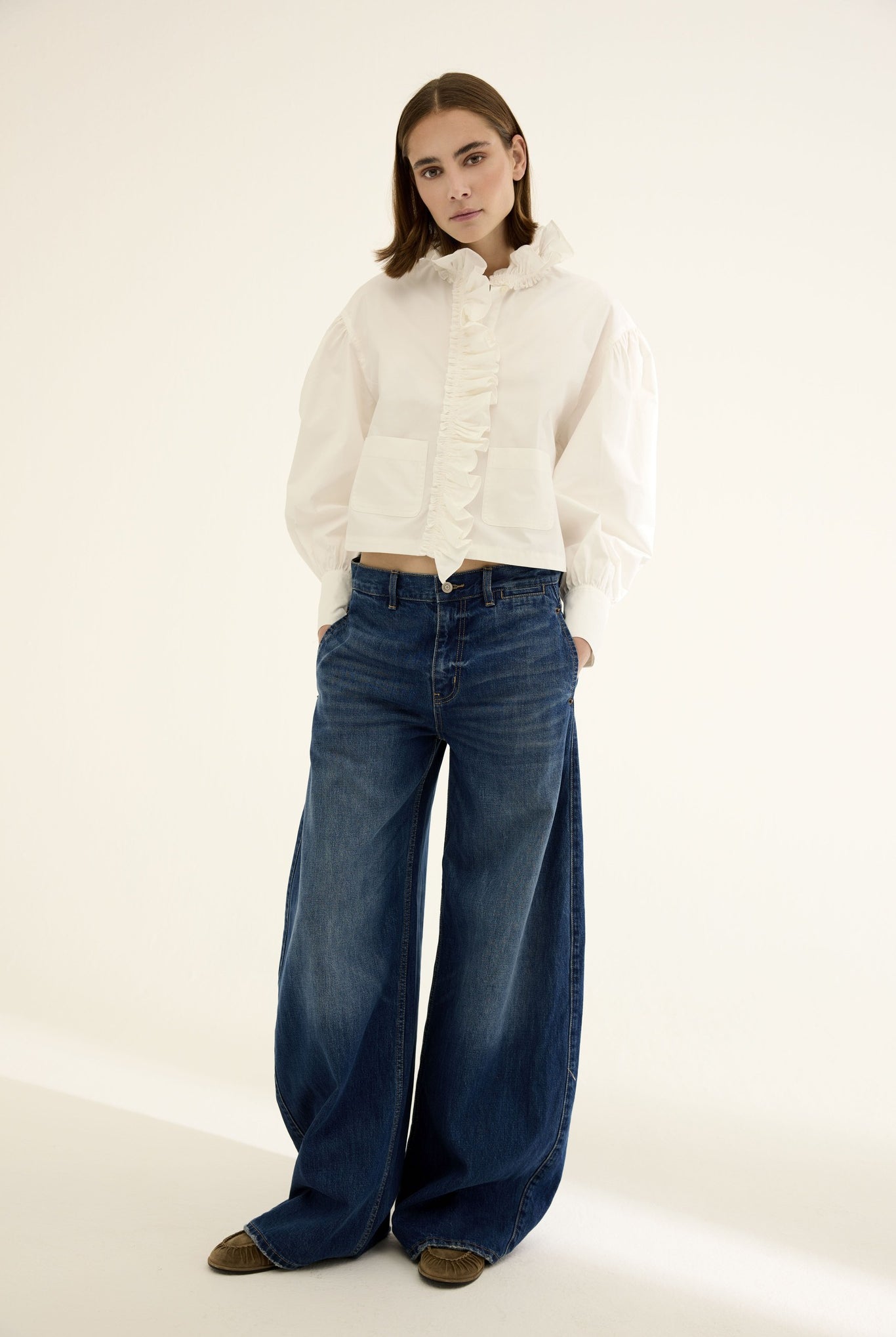Voel je omhuld door verfijnde elegantie met de Karina blouse Donkerblauw. Deze blouse onderscheidt zich door een romantische ruches-rij langs de voorkant en een hoge kraag die je look een speelse, maar toch chique touch geeft. De lange mouwen met subtiele plooien zorgen voor een luchtige en vrouwelijke pasvorm die zacht om je heen valt.
