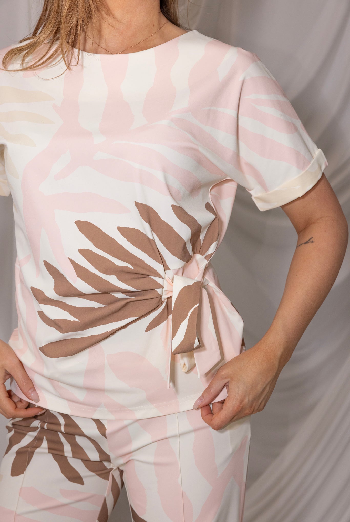 De Negin Top Print is een verfijnd item dat onmiddellijk in het oog springt door zijn elegante ronde hals en delicate print in ingetogen groentinten. Dit item heeft korte mouwen en een flatterend zijstrikontwerp dat de taille subtiel accentueert, waardoor het een tijdloze uitstraling krijgt.