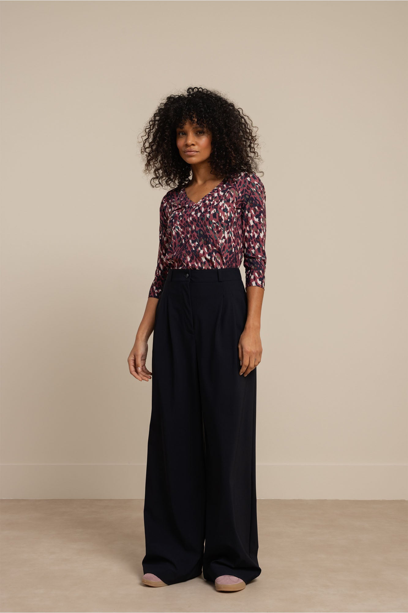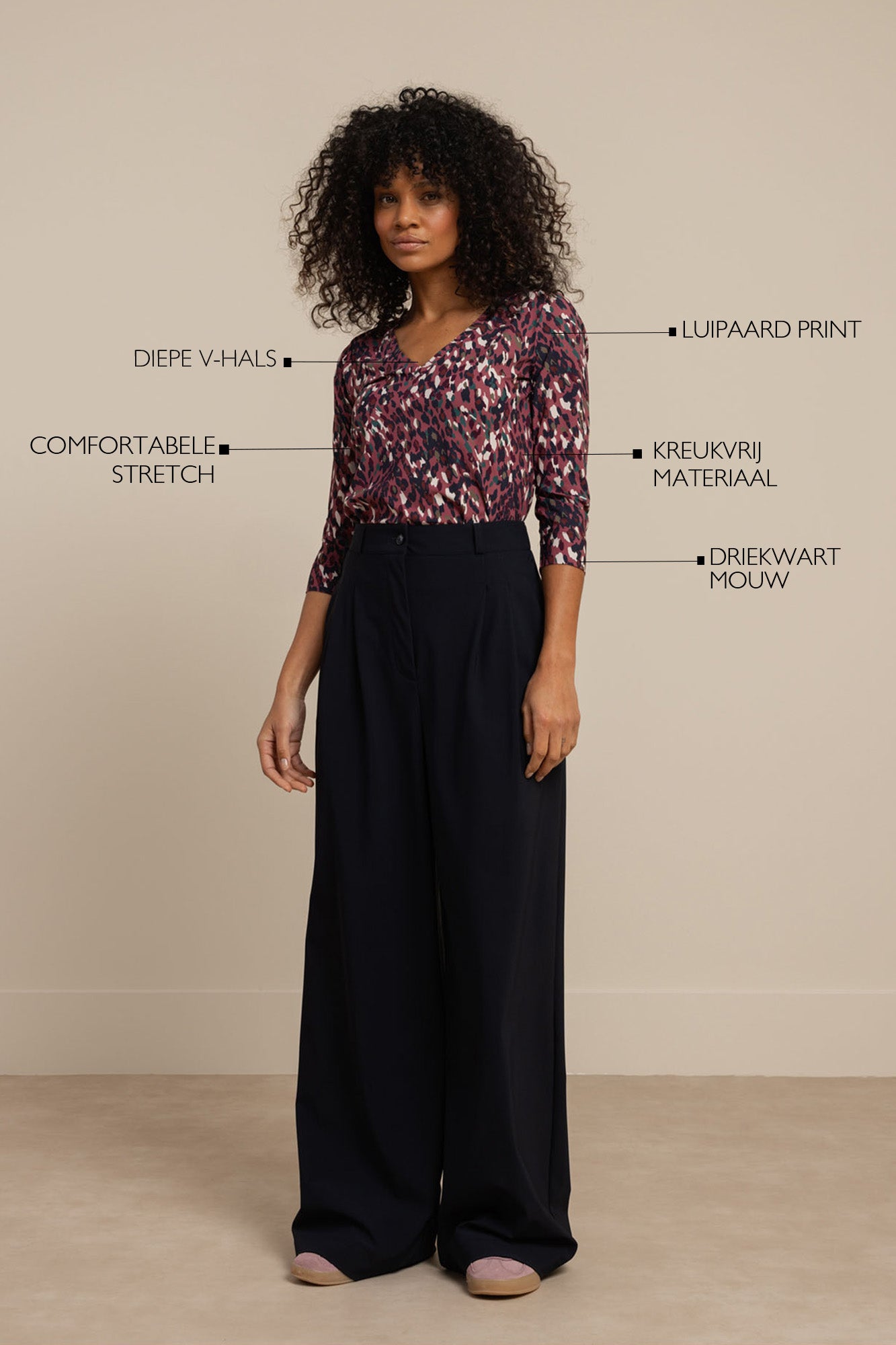De Emma leopard top Print is een echte blikvanger met zijn stijlvolle luipaardpatroon en diepe V-hals. Deze top kenmerkt zich door de soepele, stretchstof die zorgt voor een comfortabele pasvorm en driekwart mouwen. Ideaal voor jouw drukke dagen dankzij het kreukvrije materiaal, dat er altijd netjes uitziet.