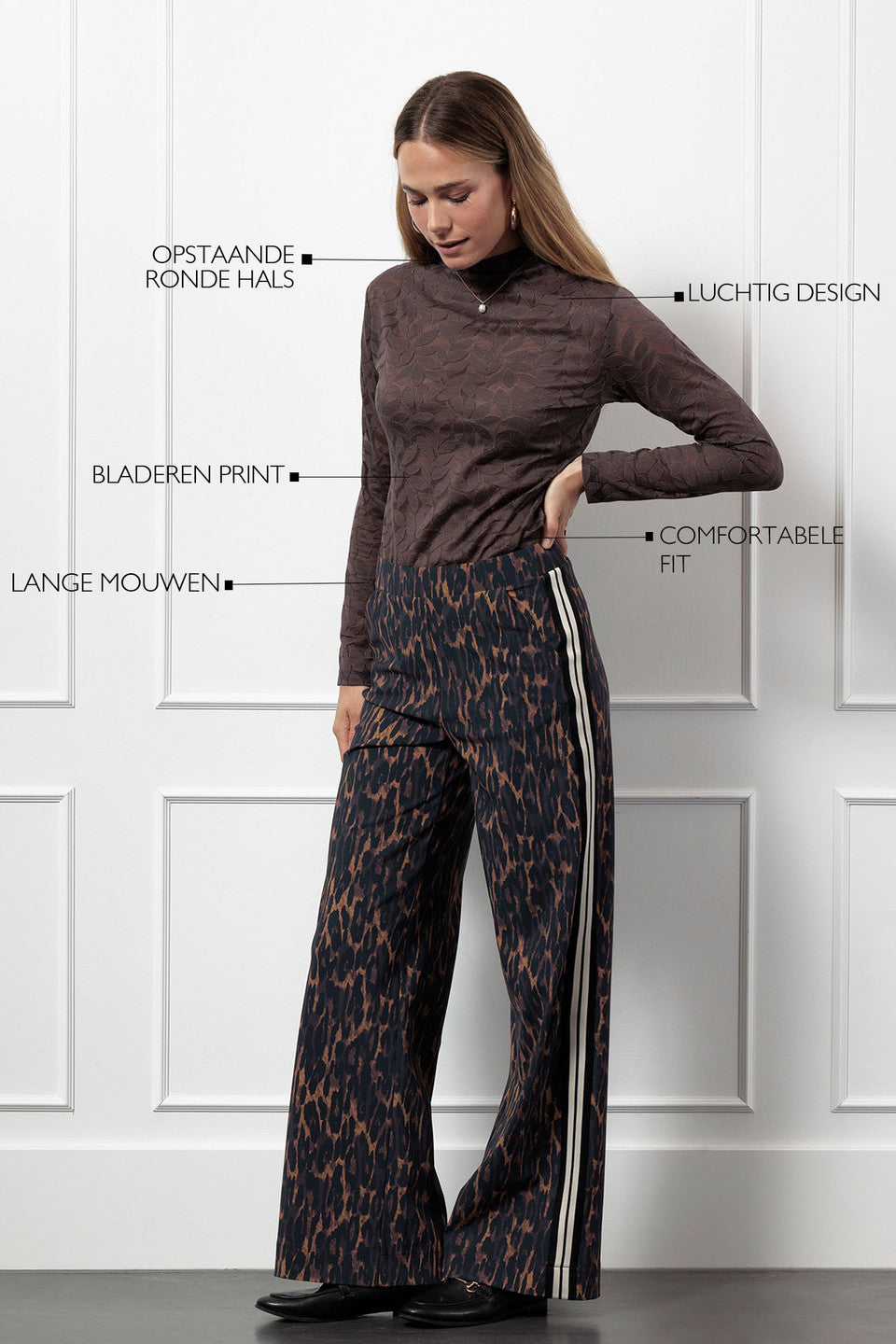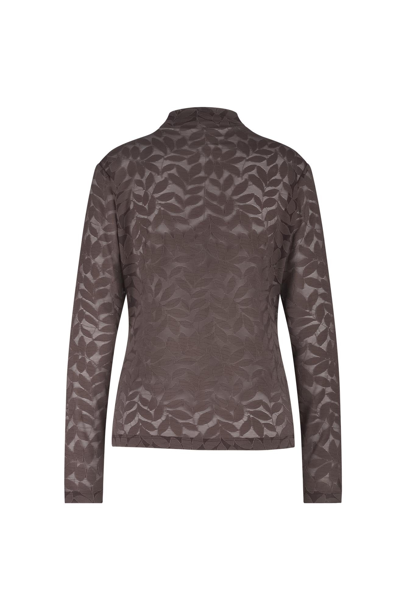 Ervaar het ultieme comfort met de Reagan lace top Bruin. Deze prachtige top van Studio Anneloes heeft een verfijnd bladpatroon dat subtiel door de bruine stof loopt. Met zijn aangesloten pasvorm en opstaande kraag straalt het klasse uit. De lange mouwen maken het een perfecte keuze voor zowel een dag op kantoor als een avondje uit.