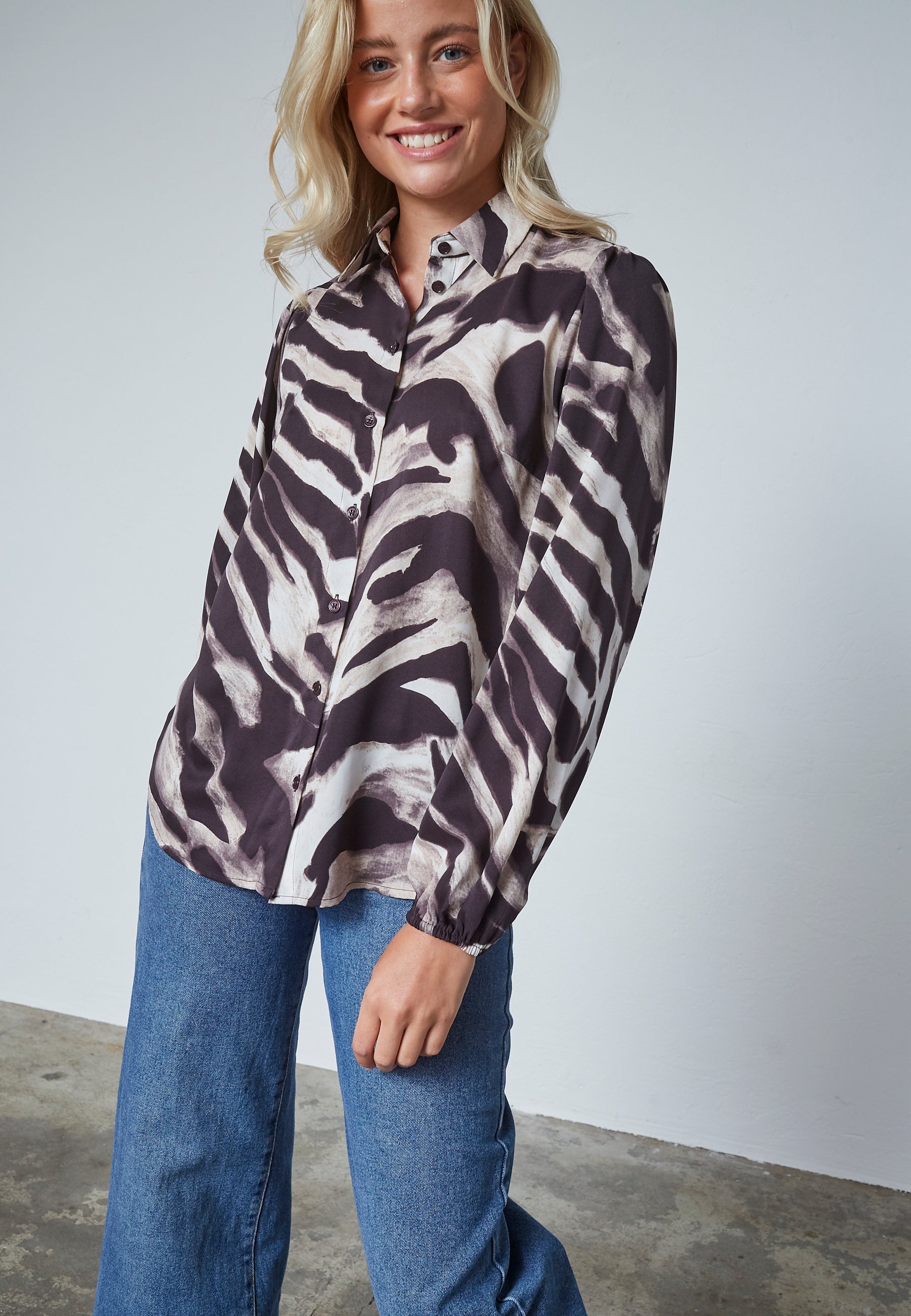 Ontketen je innerlijke fashionista met het EBBEY-SH74 Shirt Print. Dit item van Sisters Point combineert moeiteloos speelse zebra-achtige prints met een verfijnde blousekraag. De lange mouwen en het relaxte design geven een nonchalante maar zelfverzekerde look. De luchtige stof voelt heerlijk aan op de huid en beweegt soepel met je mee.