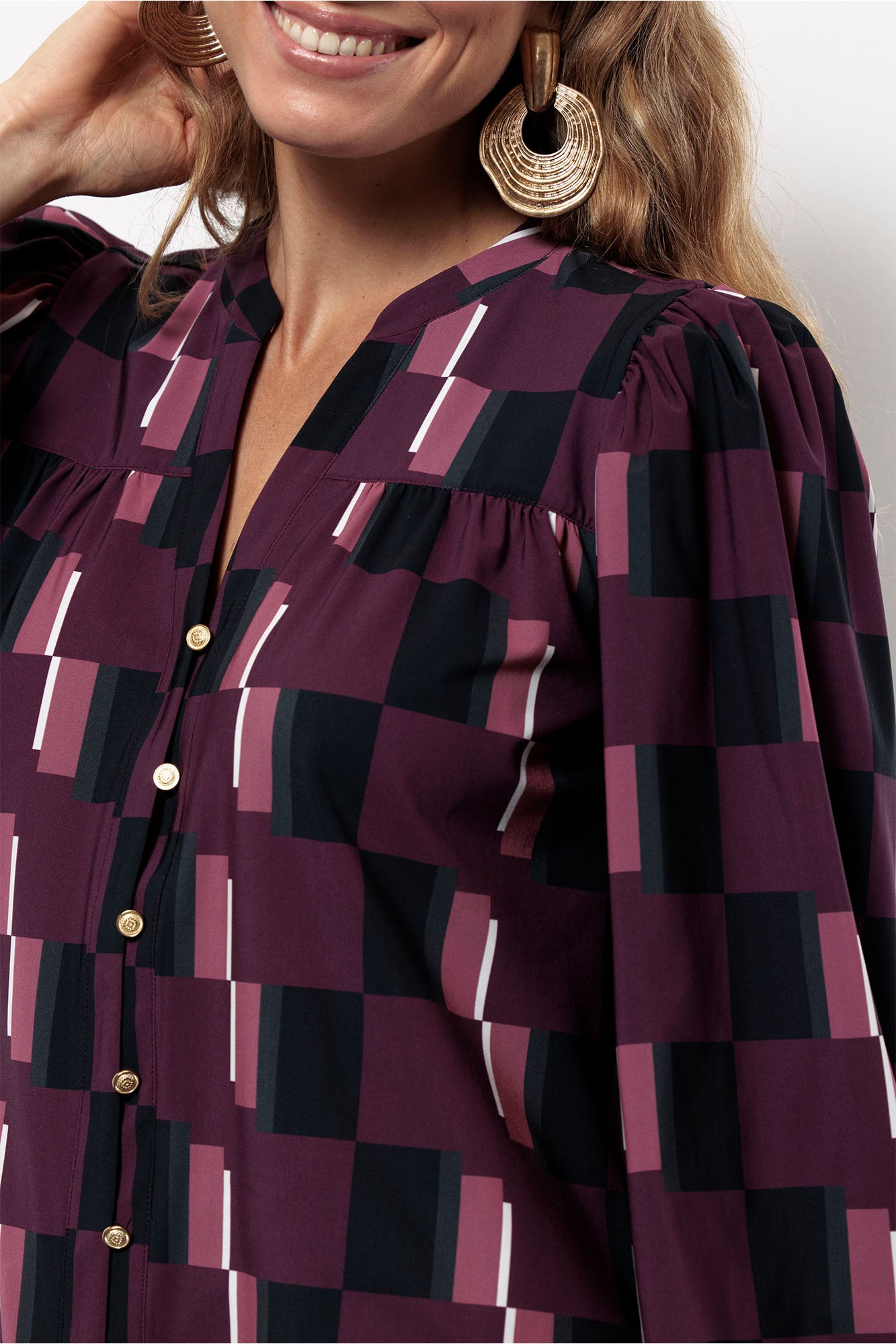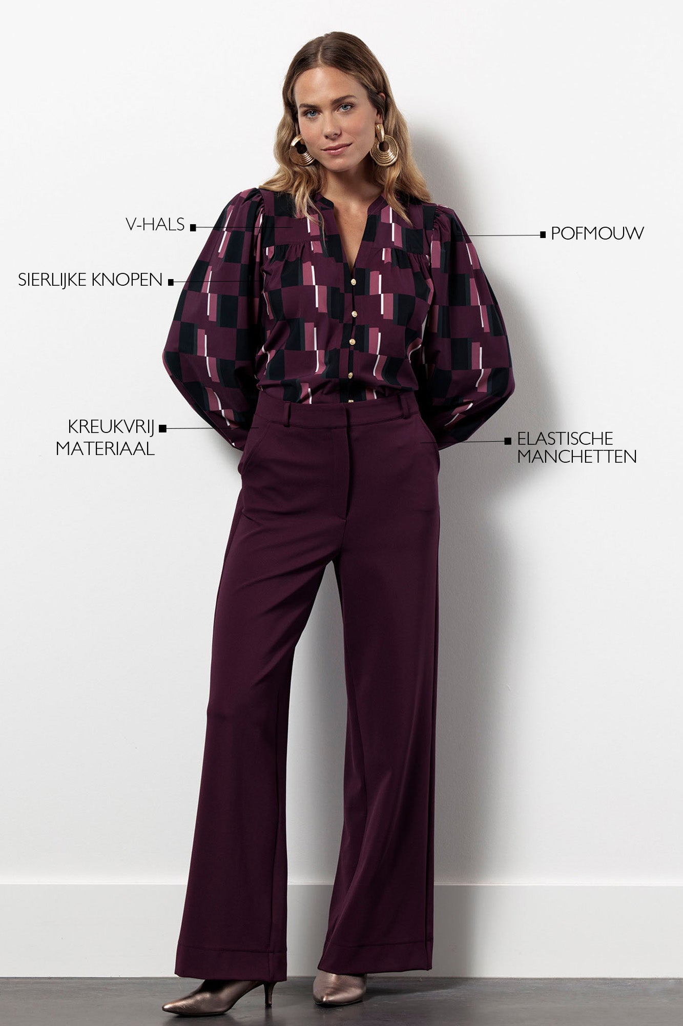Stap in stijl met de Flor block blouse Print van Studio Anneloes. Deze blouse heeft een prachtige paars-zwarte blokprint en een elegante V-hals, perfect voor zowel kantoor als een ontspannen dagje uit. Dankzij de lange mouwen en de luchtige stof biedt dit item je het comfort dat je zoekt.