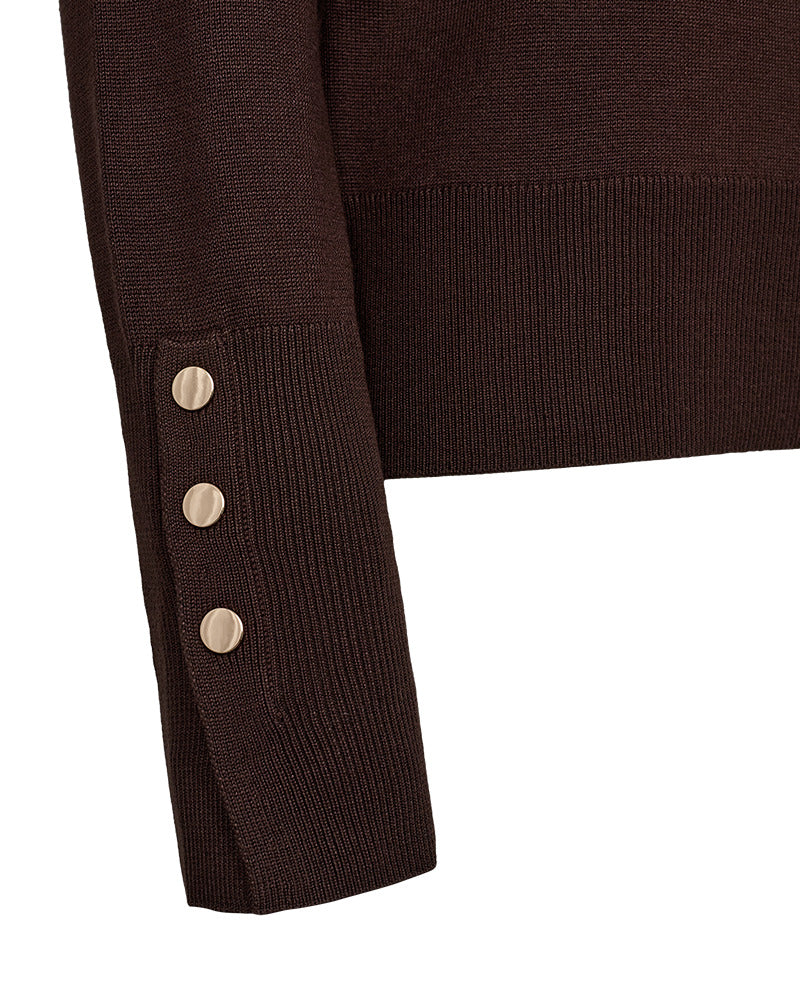 De FQKATIE-PULLOVER in donkerbruin biedt je de essentie van Scandinavische eenvoud. Met een elegante col en lange mouwen zorgt dit item voor een tijdloze look. De subtiele knopen op de mouw boeien voegen een verfijnd detail toe.