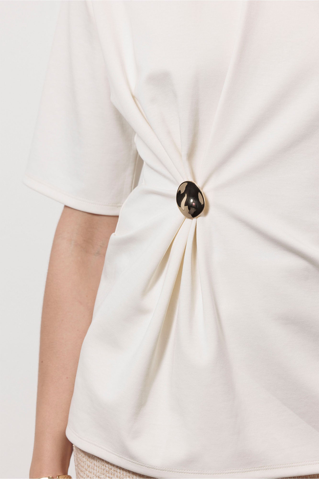Maak kennis met de Almamia top in Beige / Ecru van Studio Anneloes. Deze stijlvolle top heeft een flatterende ronde hals en korte mouwen, perfect voor elke dag. De subtiele plooi met goud detail voegt net dat beetje extra toe wat je zoekt in een item.