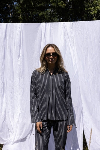 Verfijn je garderobe met de Chevy Blouse Print van Kimara. Deze stijlvolle blouse combineert een rechte pasvorm met een tijdloos gestreept patroon, perfect voor wie op zoek is naar elegante eenvoud. De klassieke kraag en lange mouwen zorgen voor een verfijnde uitstraling.