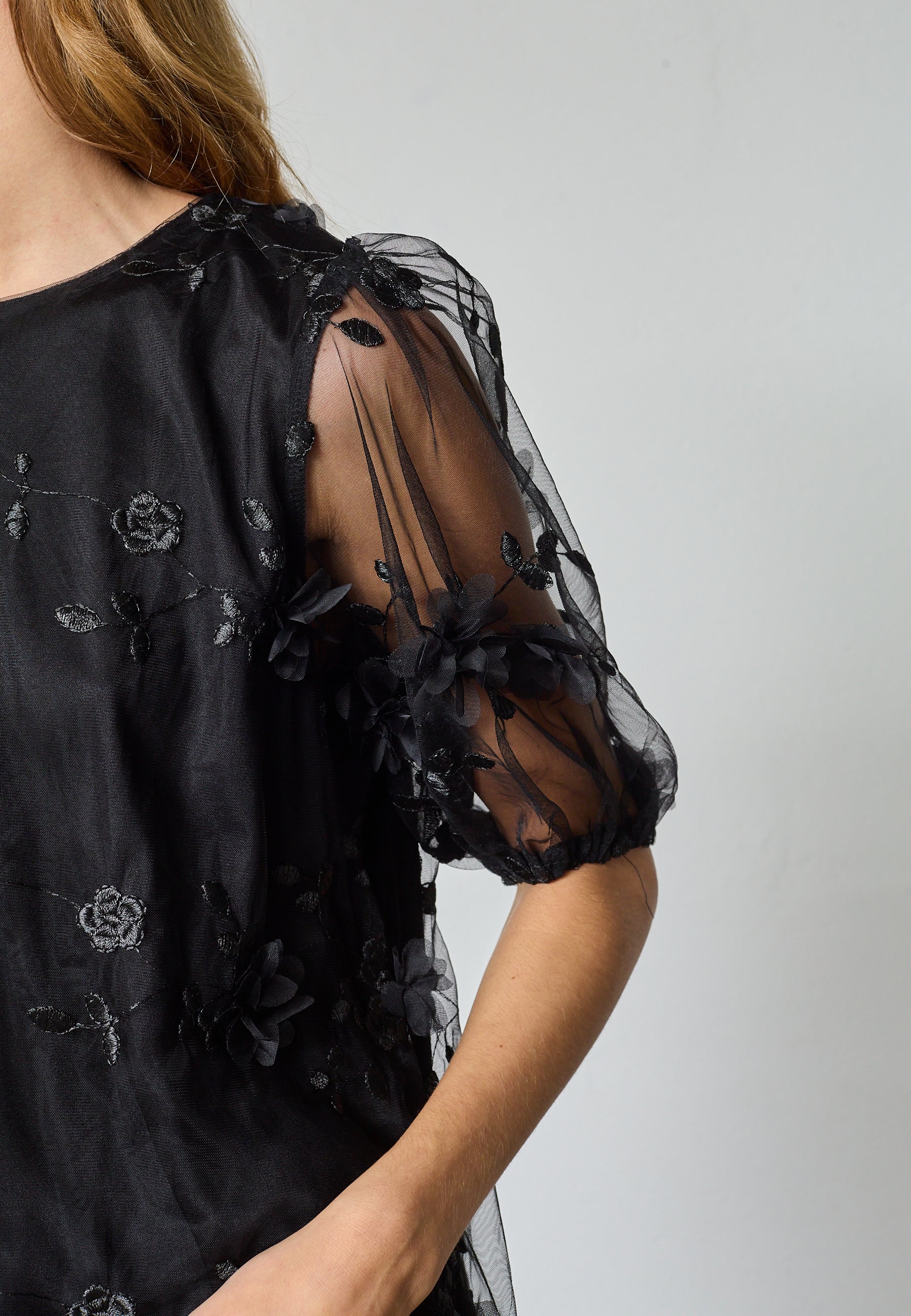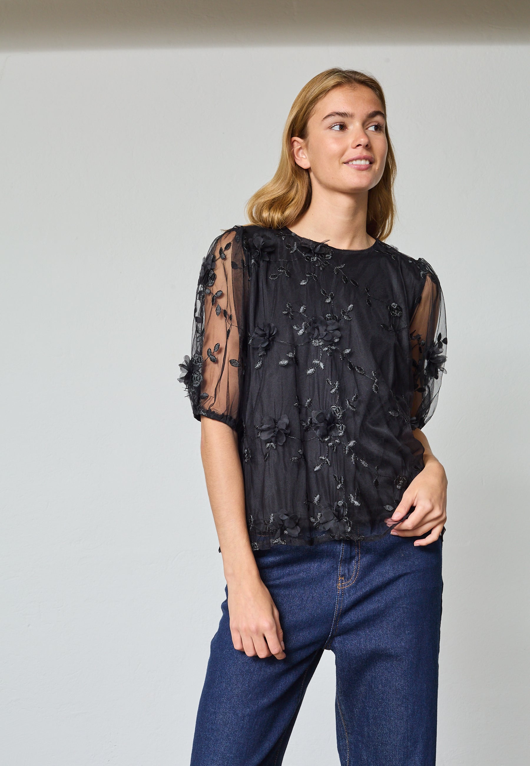 Ga voor een trendy en zelfverzekerde look met de GEMBA-SS Zwart van Sisters Point. Dit stijlvolle item heeft een flatterende pasvorm met korte mouwen en een ronde hals, perfect voor een speelse uitstraling. De zwarte kleur gecombineerd met de opvallende print geeft een moderne twist.